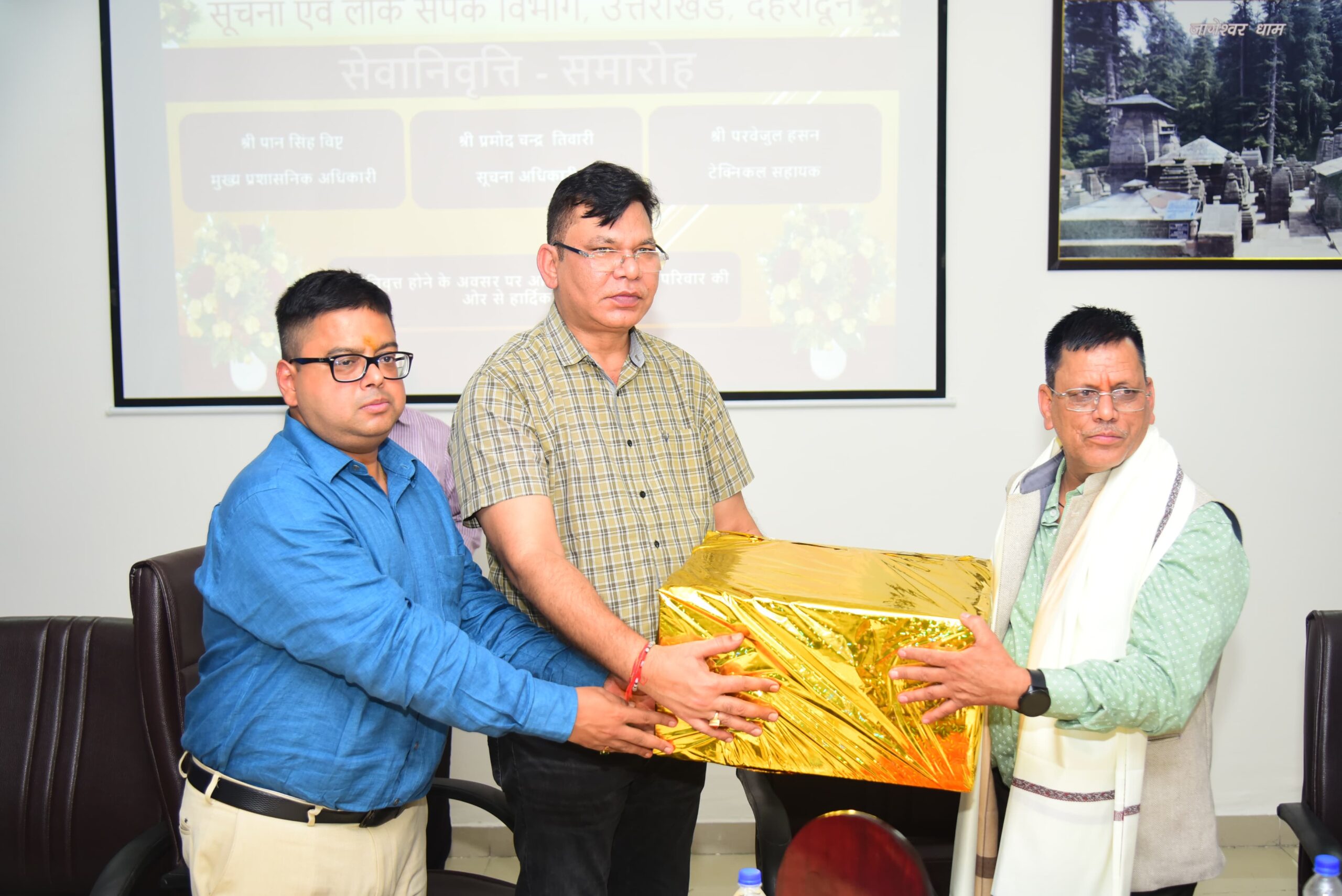 सूचना एवं लोक संपर्क विभाग उत्तराखण्ड में अधिवर्षता आयु पूरी करने पर मुख्य प्रशासनिक अधिकारी पान सिंह बिष्ट, सूचना अधिकारी श्री प्रमोद चंद्र तिवारी और टेक्निकल सहायक परवेजुल हसन को विभाग की ओर से सेवानिवृत समारोह में भावभीनी विदाई दी गई। इस अवसर पर सेवानिवृत्त हुए अधिकारियों द्वारा विभाग को दिए गए सराहनीय योगदान को अधिकारियों और कर्मचारियों ने याद किया।