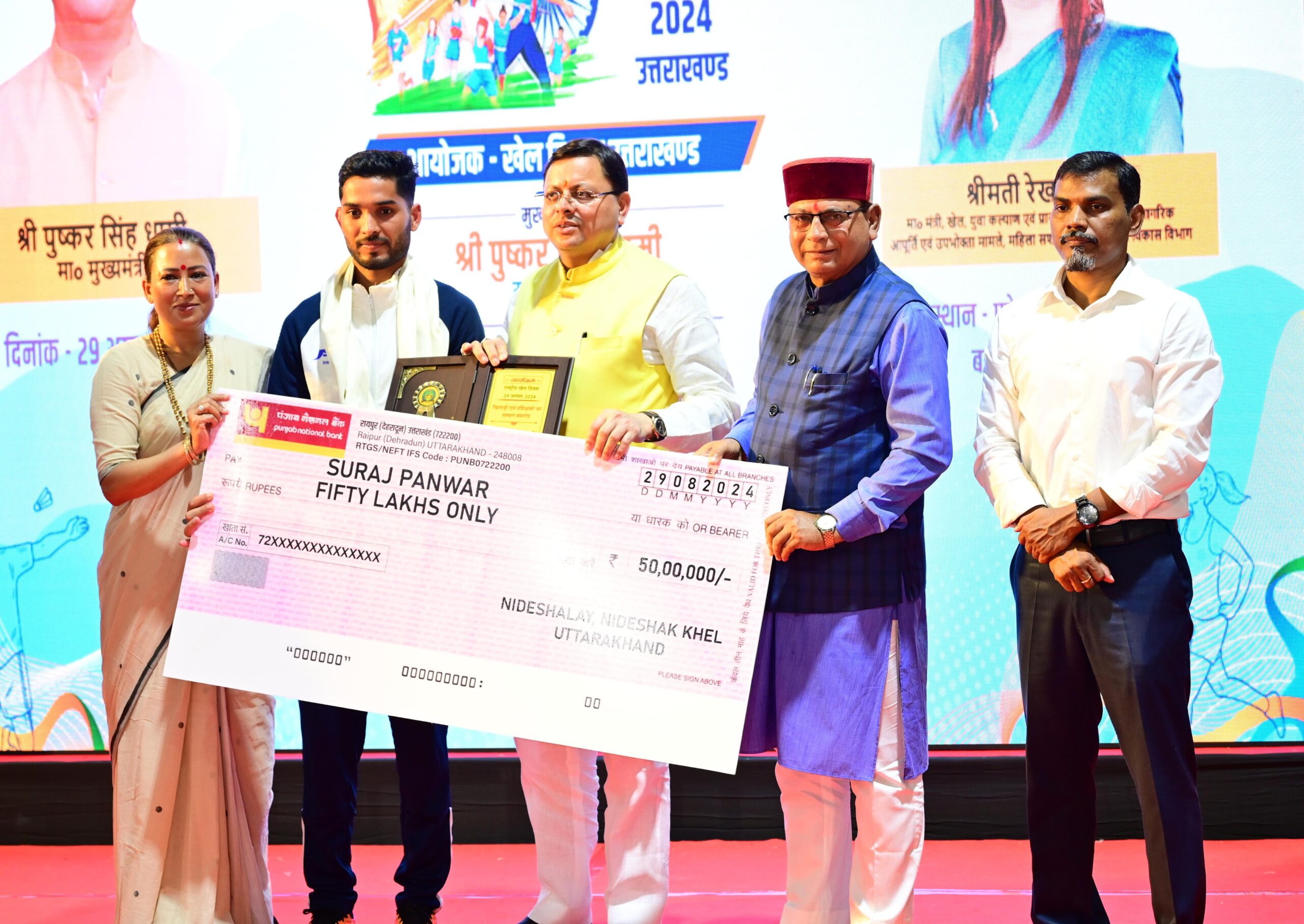 मुख्यमंत्री पुष्कर सिंह धामी ने गुरुवार को बहुउद्देशीय क्रीडा भवन, परेड ग्राउंड देहरादून में राष्ट्रीय खेल दिवस के अवसर पर आयोजित कार्यक्रम में सभी को खेल दिवस की शुभकामना दी तथा हॉकी के जादूगर के चित्र पर माल्यार्पण कर उन्हें श्रद्धांजलि अर्पित की। इस अवसर पर मुख्यमंत्री ने पेरिस ओलंपिक 2024 में प्रतिभाग करने वाले उत्तराखंड के 4 खिलाड़ियों ( लक्ष्य सेन, परमजीत सिंह, सूरज पंवार, अंकिता ध्यानी ) को 50 – 50 लाख की धनराशि के चेक प्रदान किये।