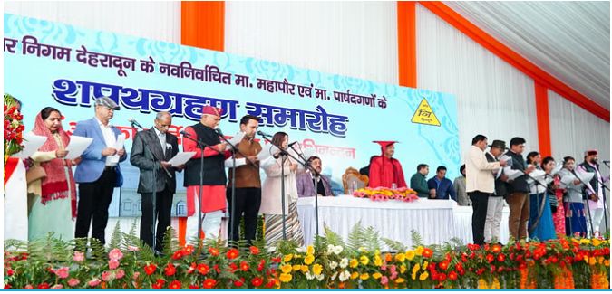 नगर निगम देहरादून में आज नवनियुक्त मेयर सौरभ थपलियाल और पार्षदों को शपथ दिलवाई गई। शपथ के दौरान मुख्यमंत्री धामी और विधायकों सहित तमाम गणमान्य लोग मौजूद रहे। मेयर और पार्षदों को शाम पांच बजे शपथ दिलाई गई। महापौर सौरभ थपलियाल को कमिश्नर गढ़वाल विनय शंकर पांडे ने शपथ दिलवाई। सभी निर्वाचित पार्षदों को सौरभ थपलियाल ने शपथ दिलावाई। इस अवसर पर कैबिनेट मंत्री प्रेमचंद्र अग्रवाल, गणेश जोशी, विधायक खजान दास, सविता कपूर, विनोद चमोली, बृजभूषण गैरोला, दुर्गेश्वर लाल, विनय रोहेला, विश्वास डाबर एवं अन्य लोग मौजूद रहे।