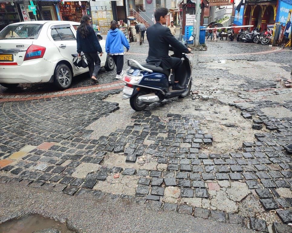 मसूरी। लगातार हो रही बारिश से मसूरी की लगभग सभी सडकें क्षतिग्रस्त हो चुकी है लेकिन मालरोड के मुख्य चौक शहीद भगत सिंह चौक की हालत बहुत खराब है। रोड के पत्थर उखड़ चुके है व गढढे बन गये है जिससे आये दिन स्कूटी सवार दुर्घटना का शिकार हो रहे हैं वहीं पैदल चलने वाले भी गढढों में पैर आने पर चोटिल हो रहे है, लेकिन लोक निर्माण विभाग की नींद नहीं खुल रही। विगत दिनों लगातार दबाव बनाये जाने पर लोक निर्माण विभाग ने गढढे भरे थे
