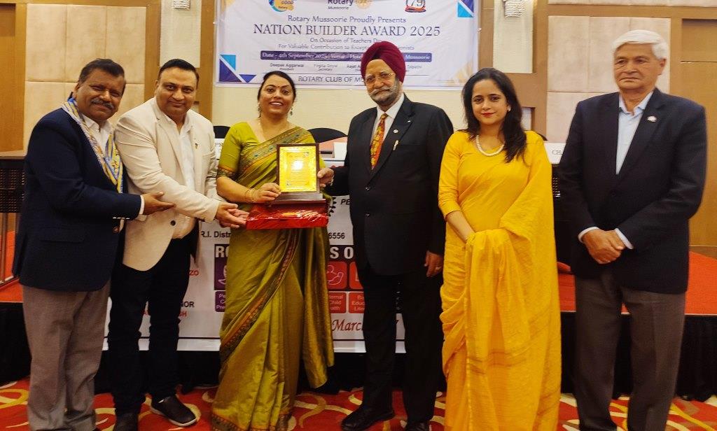 मसूरी। रोटरी क्लब मसूरी ने एक होटल के सभागार में शिक्षक दिवस की पूर्व संध्या पर उत्कृष्ट कार्य करने वाले राजकीय प्राथमिक व उच्च प्राथमिक विद्यालयों के 31 शिक्षकों व दो स्वयंसेवी शिक्षकों अशोक कोहली व अश्विनी मित्तल तथा अंतर्राष्ट्रीय ब्लाइड रैफरी व सेंट लारेंस के व्यायाम शिक्षक सेमुएल चंद्र को नेशन बिल्ड अवार्ड से प्रशस्ति पत्र व उपहार देकर सम्मानित किया।