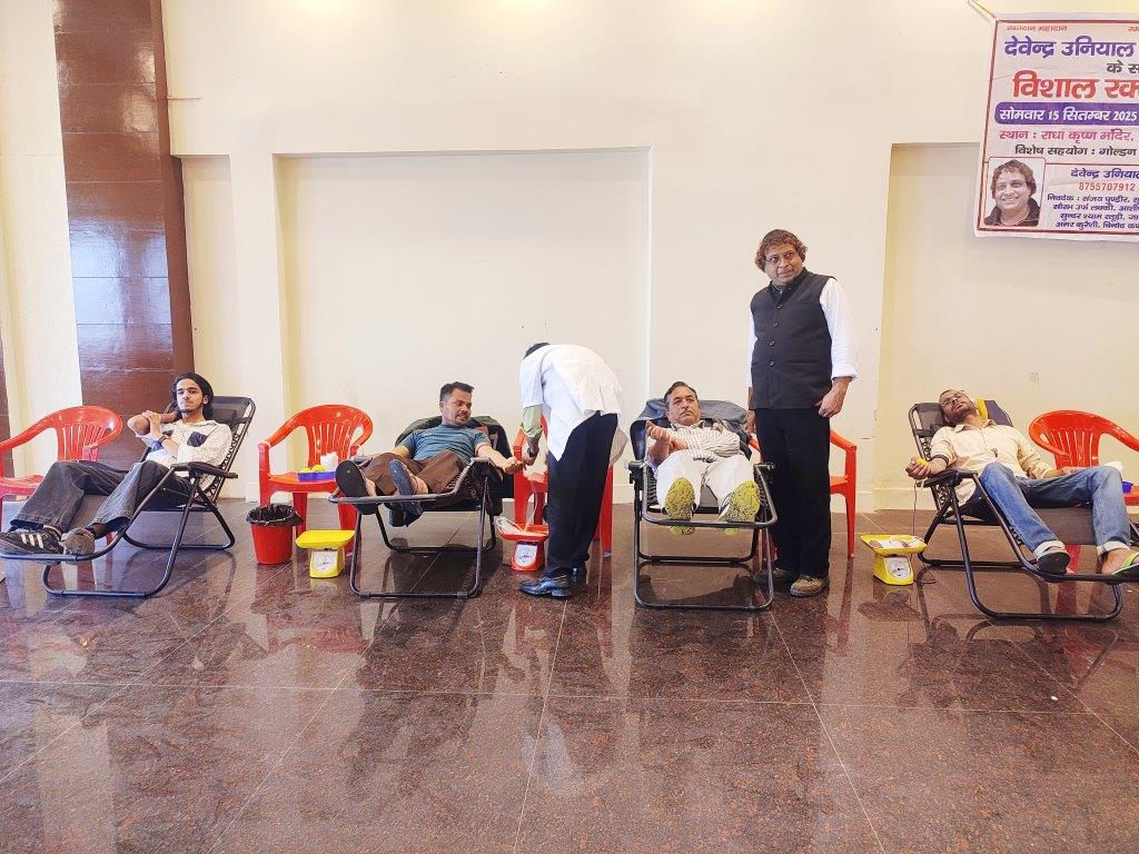 राधाकृष्ण मंदिर में आयोजित रक्तदान शिविर में मंहत इंद्रेश अस्पताल के सहयोग से रक्तदान शिविर का आयोजन किया गया। शिविर का उदघाटन व्यापार संघ अध्यक्ष रजत अग्रवाल, लायनेस हिल्स अध्यक्ष अनुपम हांडा, सचिव अंबुज अग्रवाल, ममता भाटिया, शहर कांग्रेस अध्यक्ष अमित गुप्ता, व देवेंन्द्र उनियाल ने रीबन काटकर किया। शिविर के आयोजक