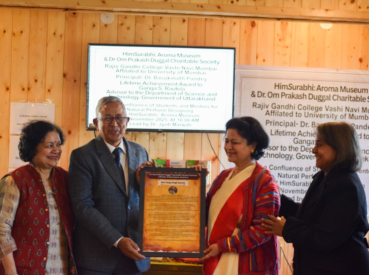 कार्यक्रम में डा, गंगा सिंह रौतेला को मुख्य अतिथि अल्पना पंत जोशी, राजीव गांधी कालेज मुबंई के प्रधानाचार्य डा. बीएन पांडे, आरके मारवाह व रमेश चमोली ने संयुक्त रूप में लाइफ टाइम अचीवमेंट अवार्ड दिया गया। वहीं डा. त्योति मारवाह, धनश्री पाटिल व ए राजालक्ष्मी लिखित बेरी व्हासपिर्स पुस्तक का लोकार्पण जीए रौतेला, अल्पना पंत, जोशी, व डा. बसुकिनाथ पांडे ने किया। हिम सुरभि म्युजियम में आयोजित कार्यक्रम में बतौर मुख्य अतिथि सहायक महानिदेशक एम एंड सी अल्पना पंत शर्मा ने कहा कि यहां पर मुंबई से आये छात्र छात्राओं को प्राकृतिक फूलों से इत्र बनाने के लिए कार्यशाला का आयोजन किया गया। जहां प्राकृतिक फुूलों ने बने इत्र के बारे में बताया जो मसूरी व मसूरी की प्राकृतिक संपदा को संरक्षित रखने के लिए बहुत अच्छा कार्य कर रही है। वहीं वन विभाग के साथ भी कई प्रोजेक्ट कर रही है। उन्होंने इस मौके पर कहाकि मसूरी में इस बार बड़ा नुकसान हुआ है, इसके लिए मानव जनित कारण है, प्रकृति से छेडछाड, के कारण ही उत्तराख्ंाड व हिमालयी राज्यों में इस तरह की आपदाएं आ रही है इस पर रोक लगनी चाहिए वरन भविष्य में बड़ी त्रासदी देखने को मिलेगी। उन्होेने कहा कि इसके लिए सस्टनेबल पॉलिसी बनानी होगी व यूनाइटेड नेशन के लक्ष्य पर कार्य करना होगा। मसूरी वासियों को इस बारे में जागरूक होना पडेगा ताकि मसूरी की प्राकृतिक संुदरता बनी रहे व यहां के ईको सिस्टम को मेंटेंन रखना होगा। इस मौके पर लाइफ टाइम अचीवमेंट अवार्ड मिलने पर गंगा सिंह रौतेला ने कहा कि डा. ओम प्रकाश दुग्गल चेरिटेबल सोसाइटी का आभार व्यक्त किया व कहा कि हिम सुरभि का आरोमा म्युजियम मुबंई से आये बच्चों को इत्र बनाने का प्रशिक्षण दिया जा रहा है, यह एक्टिविटी बच्चों में प्रकृति के प्रति जागरूकर करने व यहां के प्राकृतिक संसाधनों से इत्र बनाने के लिए प्रोत्साहित होगे इससे बच्चों को नया अनुभव मिलेगा व उनमें इंटरेस्ट बढेगा जिससे ये छात्र आगे जाकर इस दिशा में इत्र उद्योग में अपना कैरियर बनायेंगे। अब समय आ गया है कि केवल नौकरी के भरोसे जीवन नहीं चल सकता, उन्हें अपने स्तर पर कार्य करना होगा, उन्हें जीवन में नया करने की सीख देनी चाहिए ताकि वे स्वयं का रोजगार पैदा कर रोजगार दे सके व अपने व्यवसाय को बढा सके। इस मौके पर हिम सुरभि की निदेशक डा. ज्योति मारवाह ने कहा कि हिम सुरभि का उददेश्य युवा पीढी को व्यवसाय से जोड़े ताकि वे स्वय का रोजगार कर सके। इसी दिशा में यह कार्यशाला रखी गयी है, उन्होंने बताया कि वर्तमान में इत्र का व्यवसाय का बड़ा बाजार है लेकिन आज जो बाजार में इत्र मिलता है वह कैमिकल से युक्त होता है जो नुकसान दे सकता है, लेकिन अगर यह प्राकृतिक संसाधनों से बनाया जाय, इत्र के अप