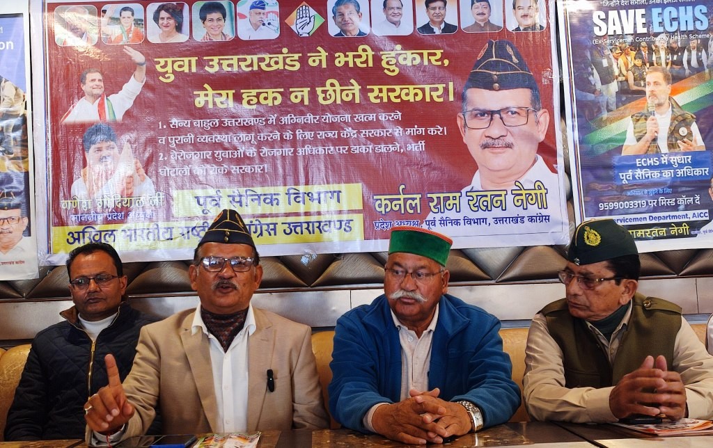 आंदोलन चलाया जा रहा है व इस मामले को संसद में उठाया जायेगा। इस मौके पर पूर्व विधायक जोत सिंह गुनसोला ने कहा कि उत्तराखंड सैनिक बाहुल्य क्षेत्र है पहला सीडीएस उत्तराखंड से बने यह हमारा सौभाग्य है, लेकिन सरकार की अग्निपथ योजना ऐसी हे जहां सैनिक जब तैयार हो रहा है वहीं रिटायर हो रहा है। इसमें योजना में रिटायर होने के बाद कोई सुविधा उनको नहीं मिल रही, न शहीद का दर्जा मिलेगा, ने पेशन मिलेगी, न ग्रेच्युटी मिलेगी, न स्वास्थ्य सुविधा मिलेगी यह यहां के नौजवानों के साथा धोखा है, यहां का युवा फौज में जाने को सम्मान मानता था लेकिन आज उनको चार बाद चौराहे पर खडा करने के लिए छोडा जा रहा है। इसका विरोध जायज है, अब तो महिलाएं भी सेना में जा रही है उनके लिए यह यह हताशा बन गयी है। इस मौके पर पूर्व सैनिक कांग्रेस प्रदेश अध्यक्ष कर्नल राम रतन नेगी, पूर्व विधायक जोत सिंह गुनसोला, शहर कांग्रेस अध्यक्ष अमित गुप्ता, विचार मंच उपाध्यक्ष केंद्रीय कांग्रेस डा. आरपी ध्यानी, प्रदेश उपाध्यक्ष पूर्व सैनिक कांग्रेस कैप्टन गोपाल गडिया, आलम सिंह रावत, छावनी परिषद के पूर्व उपाध्यक्ष महेश चंद, महामंत्री राजेश मल्ल, तेजपाल रौथाण, महिमानंद, आदि मौजूद रहे